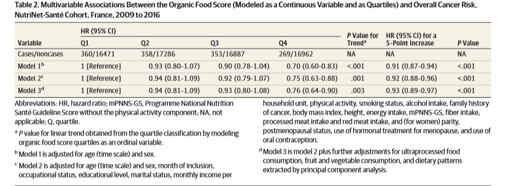 Todos esos factores pueden añadir confusión a la relación entre el consumo de productos orgánicos y el riesgo de cáncer. Por ello, los autores los consideran en un modelo estadístico (regresión de Cox), dividiendo el consumo en cuatro cuartiles.